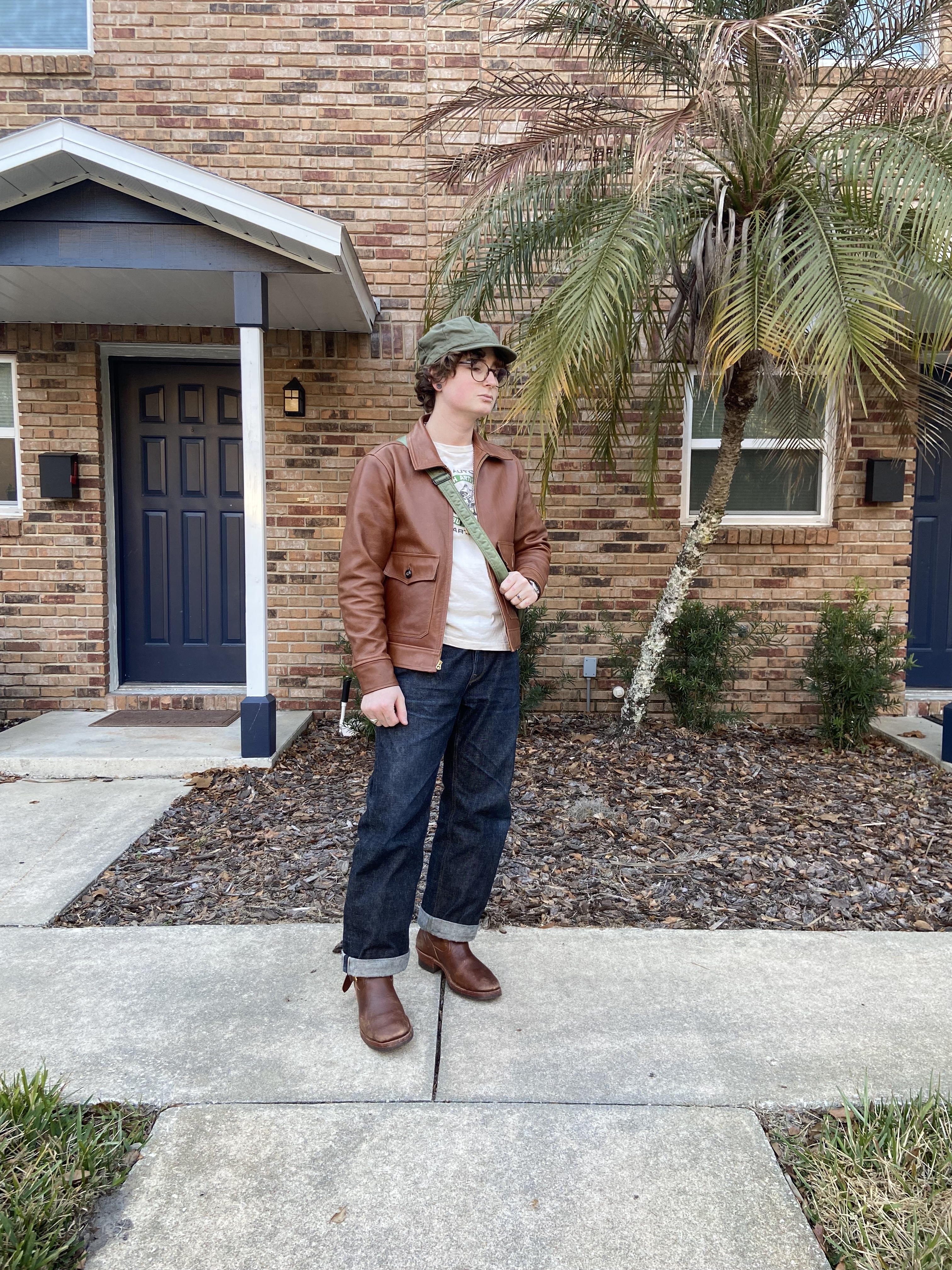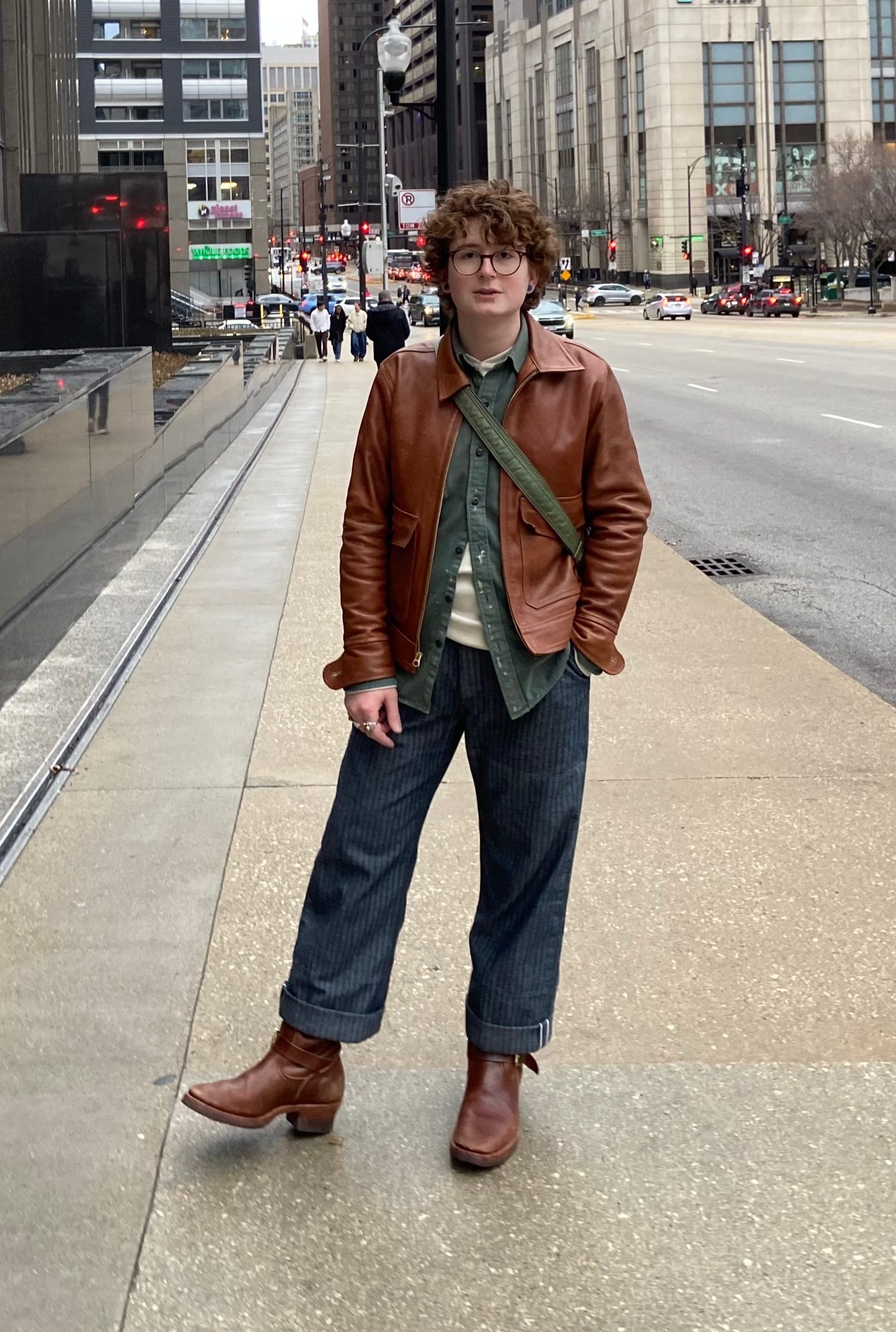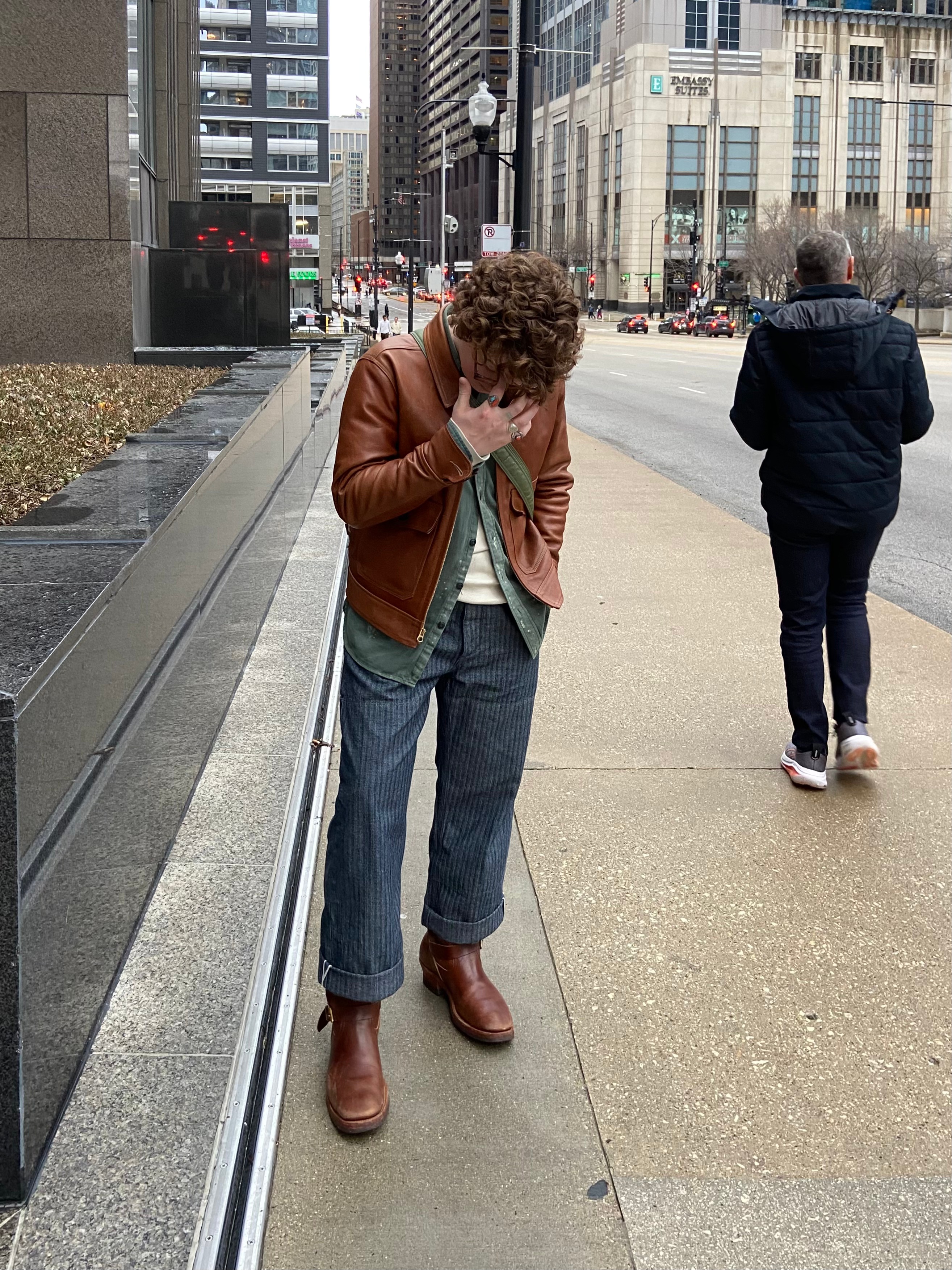 This outfit, on the other hand, is I think my favorite way that I’ve styled this jacket. I had just picked up these Freenote pants the day before, and really had a vision and ran with it. The color palette is very reminiscent of the first outfit in this post, but I think this is a much more visually interesting outfit. I really like all the textures at play — the herringbone-twill pants, the waffle-knit henley, the grain of the leather. The very tasteful wear on the boots and the much less tasteful paint splatters on the green shirt. As I felt that this was a somewhat Kyle Foxworth-like outfit, I decided to emulate his style a little by only buttoning the top half of the shirt. I will also note another point in this outfit’s favor, is that it was remarkably comfortable to wear. Now, of course, all my clothes are deeply comfortable in my opinion, but something about these pants with the top layers was just very cozy, without the usual sacrifices of structure, fit, or function that come with comfy clothes.
