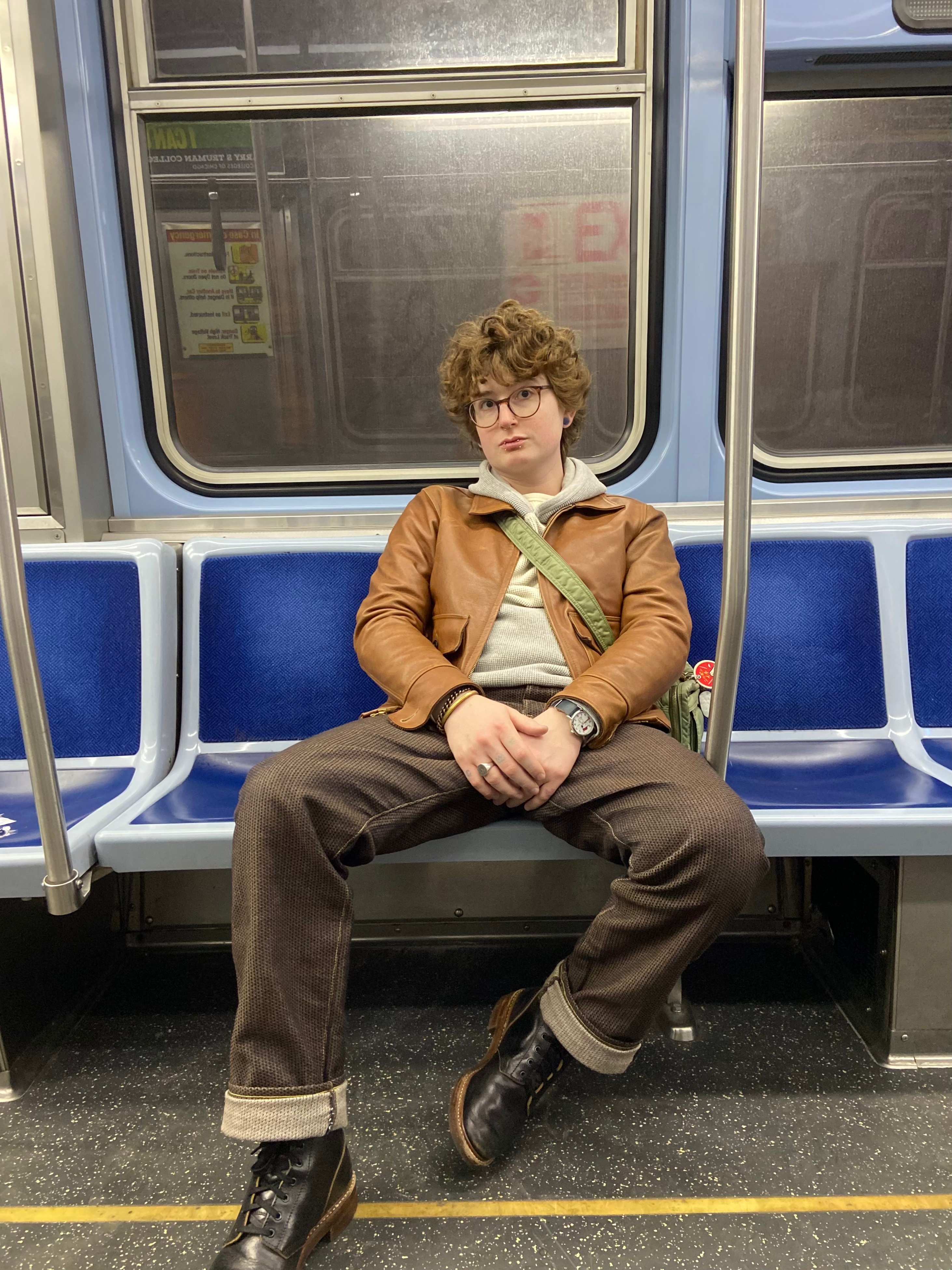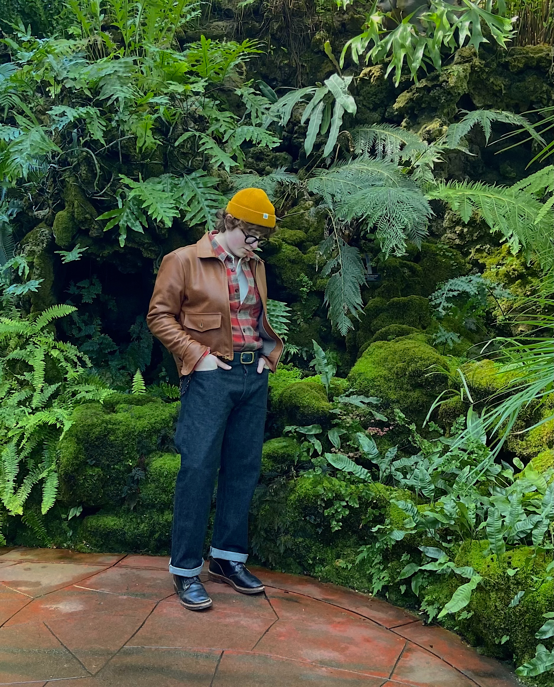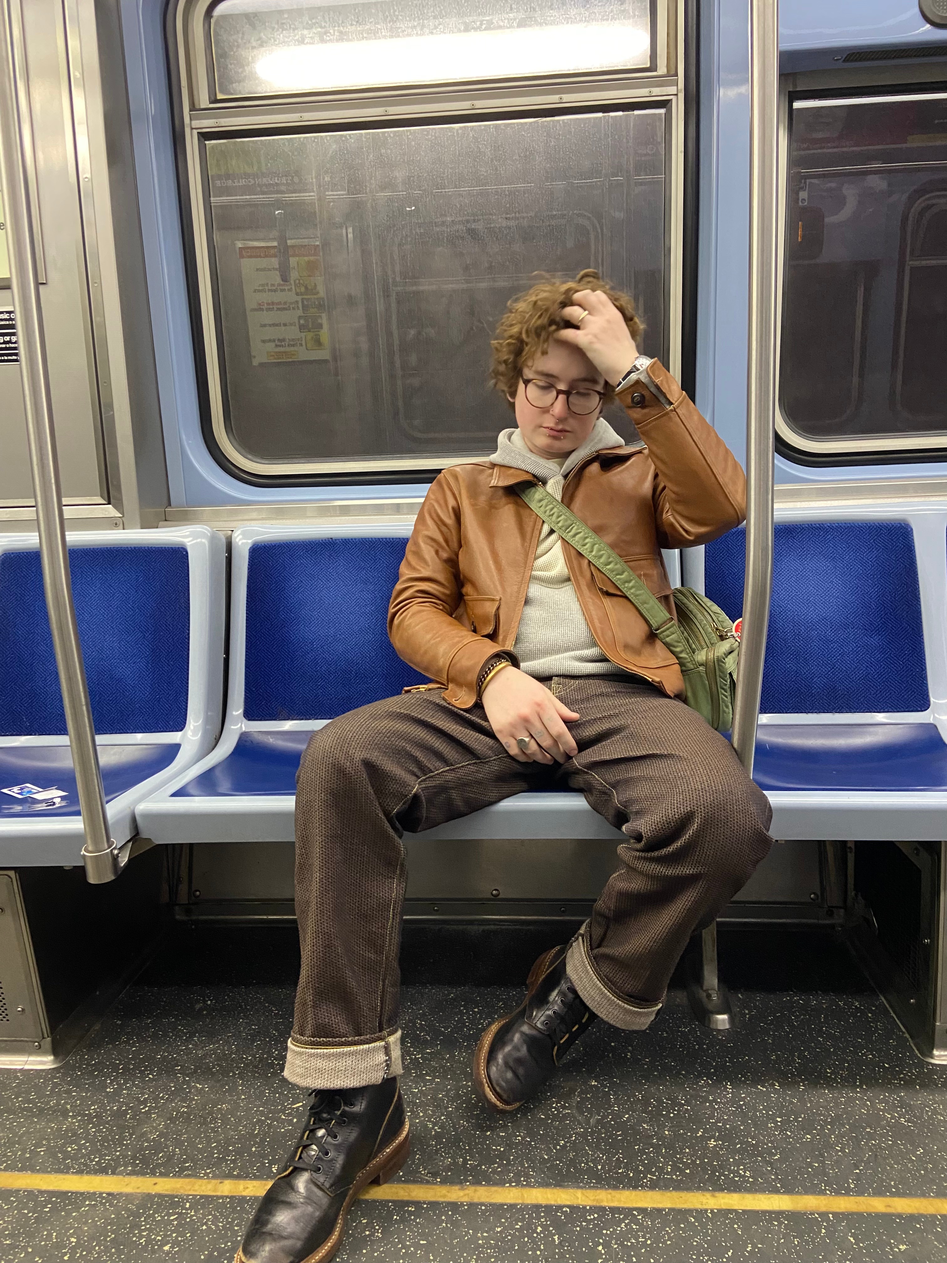 This outfit, on the other hand, is I think my favorite way that I’ve styled this jacket. I had just picked up these Freenote pants the day before, and really had a vision and ran with it. The color palette is very reminiscent of the first outfit in this post, but I think this is a much more visually interesting outfit. I really like all the textures at play — the herringbone-twill pants, the waffle-knit henley, the grain of the leather. The very tasteful wear on the boots and the much less tasteful paint splatters on the green shirt. As I felt that this was a somewhat Kyle Foxworth-like outfit, I decided to emulate his style a little by only buttoning the top half of the shirt. I will also note another point in this outfit’s favor, is that it was remarkably comfortable to wear. Now, of course, all my clothes are deeply comfortable in my opinion, but something about these pants with the top layers was just very cozy, without the usual sacrifices of structure, fit, or function that come with comfy clothes.