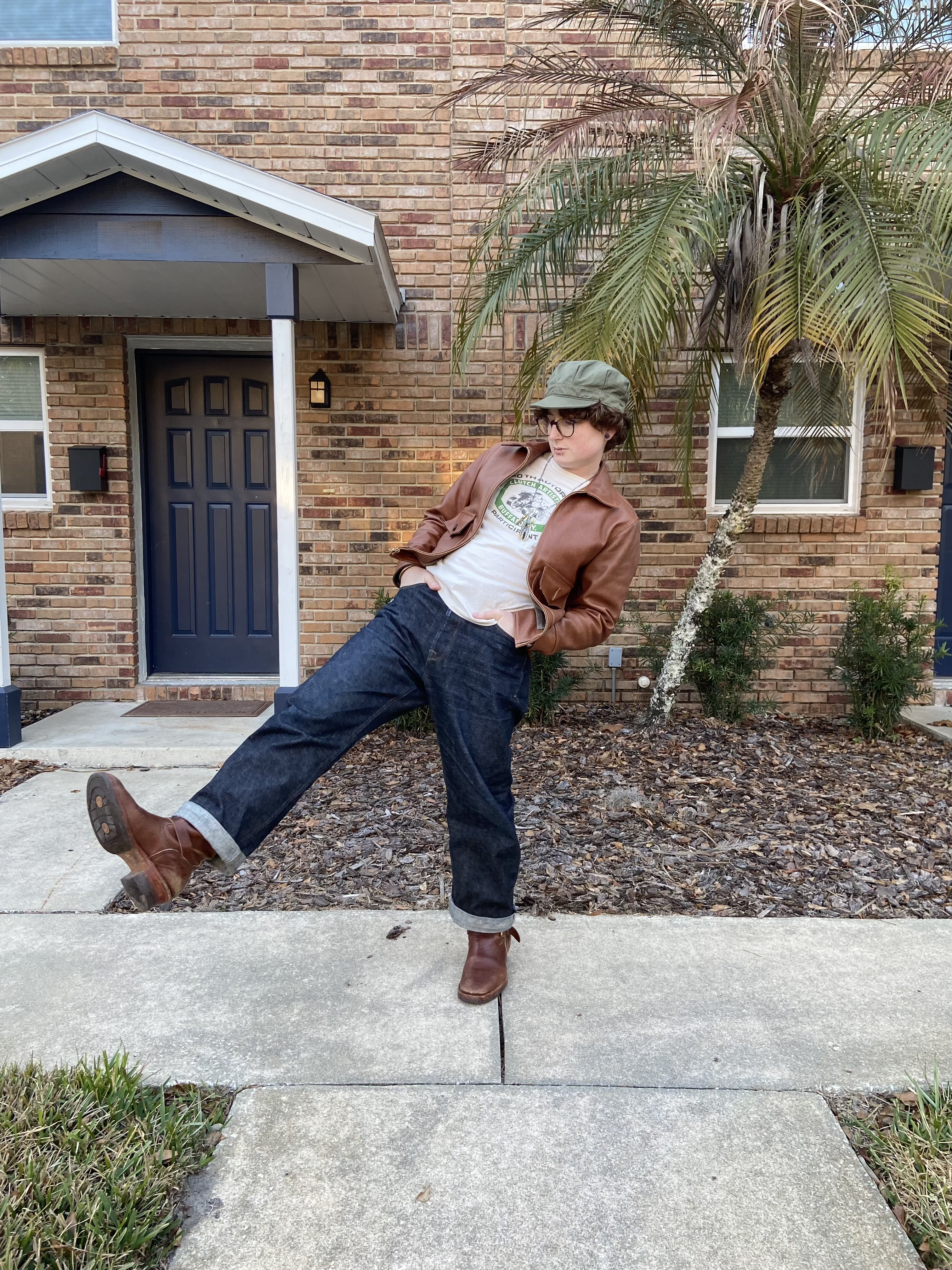 I wanted to keep it simple and let the jacket do the talking. I paired it with my Freenote jeans — also picked up at the Residency — partly because the overall jacket-jeans silhouette is timeless, but also because the two pieces speak the same design language. Both are rooted in mid-century workwear and biker details, and Freenote consistently nails that look. When I’m building an outfit around one strong piece, I look for things that already share its vocabulary rather than things that contrast with it. It also felt right to wear the two pieces together, knowing I would be sending the fit pic to Andrew and the Division Road team and I wanted to show that the jeans were going strong with just about 5 months of wear.
